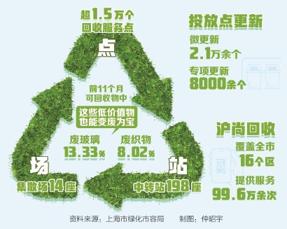 上海持续推进生活垃圾全程分类,四大类垃圾“三增一减”效果显著。以可回收物为例,今年前11个月,全市可回收物日均分出量增至8011吨,比今年前5个月日均多分出84吨。