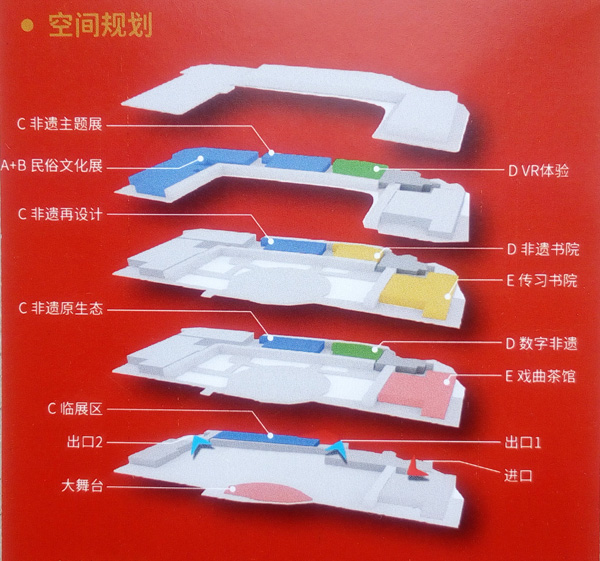 功能定位:以“非物质文化遗产”与“民俗、民族、民间”为主题,定位于非物质文化遗产的活态传承,内设五大功能业态:非遗展览、非遗表演、非遗传习、数字非遗、非遗美食。中国非物质文化遗产十大门类均可在此呈现。