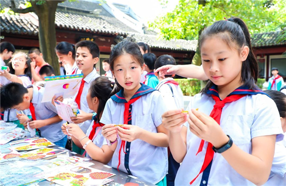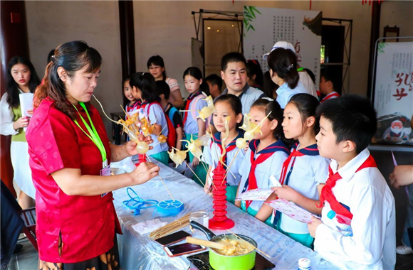 同时,明伦堂广场上还安排了形式多样的民间非遗文化体验活动,“个性糖画创作”、“吹糖人挑战”、“个性捏面人创作”、“纸伞制作”、“传统团扇绘 制”、“压花技艺体验”、“传统木偶制作”等有意思的环节,让大朋友们和小朋友们在与中国传统文化零距离接触中体验非遗文化的独特魅力,完成一个个挑战任 务。