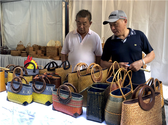 图片说明:市民正看着东南亚展销区内所陈列的商品