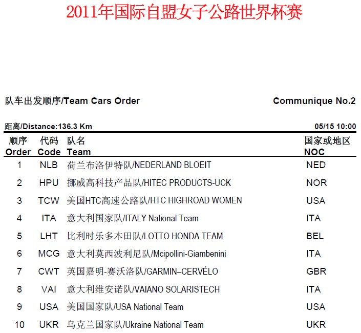2011“绿地集团”国际自盟女子公路世界杯赛队车出发顺序