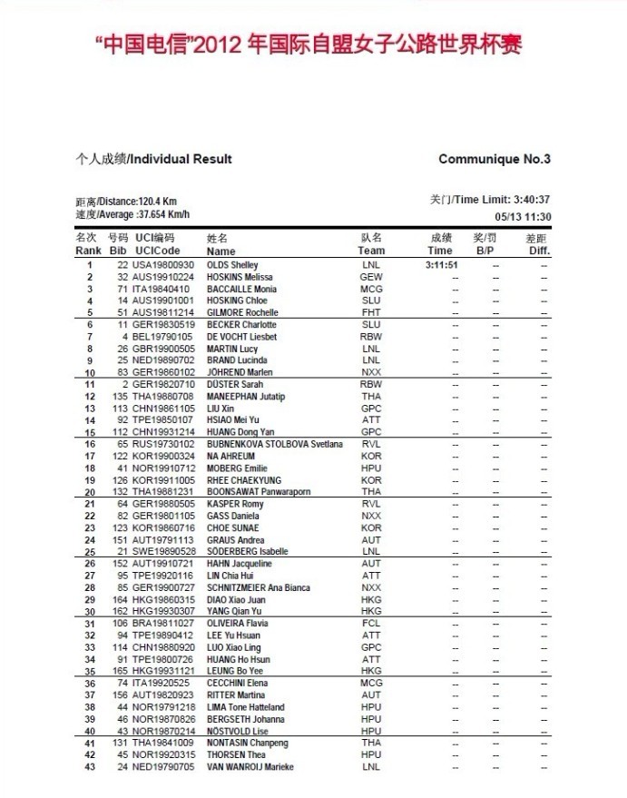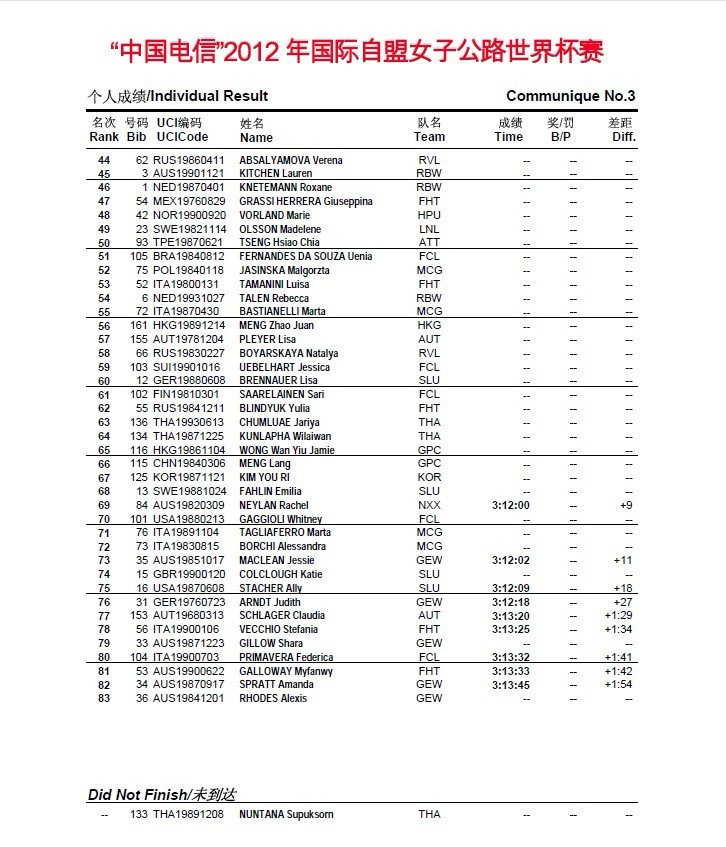 “中国电信”2012年国际自盟女子公路世界杯赛个人成绩