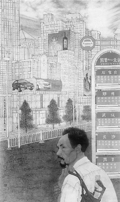 这个路口,没有红绿灯,但有一条斑马线,是允许行人过街的地方。通常,行人走到这样的街口,就应该紧张起来了。在这条钢铁躯壳的大小汽车风驰电掣的车流中,作为一个行人,要去到街道那边是不容易的。你得在时密时疏的车流中找到一个空当,在左顾右盼中来一次小小的冒险,才能把自己的身体搬运到马路对面。