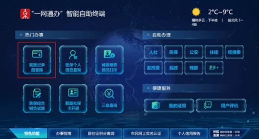 图片说明:“一网通办”智能自助终端界面。(市大数据中心供图下同) 在自助终端上办事有多方便?一分钟就能获得就医记录册。在宝山区友谊路街道社区事务受理服务中心的自助服务区,市民沈先生前来办理就医记录册业务。选择相应事项后,根据机器提示放上身份证,沈先生通过人证比对。“用完换新”“新增制册”“遗失补办”等选项中选择相应的制册原因,不一会儿,取件柜就吐出了