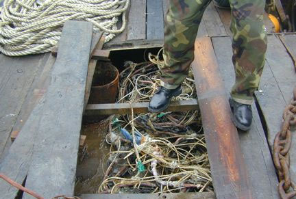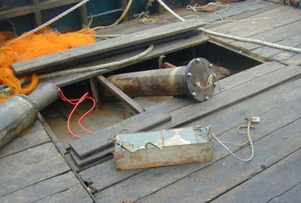 图为渔政执法人员查获的藏匿于渔船甲板下的电脉冲渔具