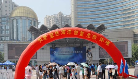 7月6日上午,东海区局与中国“航海日”组委会在上海南京路世纪广场共同举办“2008年关爱蓝色海洋,修复生态环境—生态修复暨使者行动”系列宣传活动之“使者报名”及“人工增殖放流苗种现场认购”活动。上海市水产办公室、洋山工程三期、LNG公司、上海团市委、普陀区教委、上海海洋水族馆、WWF等单位领导参加了活动。现场举办了简短的开场仪式,钟小金副局长作了宣传动员,并与李富荣局长一起向大宗认购放流苗种的单位授牌,生态修复小使者、认购放流苗种的苗种场代表发言。