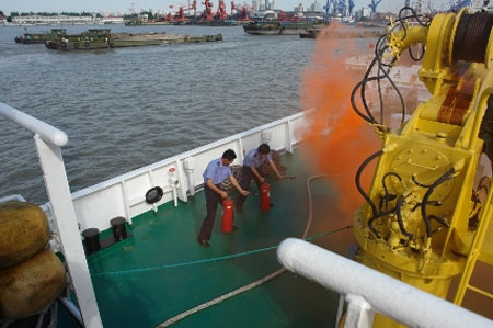 7月10日,中国渔政东海总队和上海市杨浦区消防支队在中国渔政东海总队渔政码头联合举办了船舶消防演习。