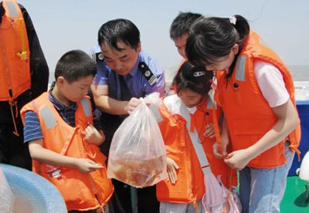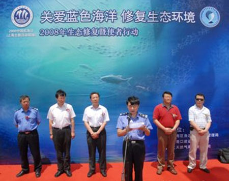 7月11日,是第四个中国航海日。当天,作为中国航海日的系列活动之一,由东海区局与洋山同盛港口建设有限公司、上海液化天然气有限责任公司在洋山港外水域共同举办了“关爱蓝色海洋,修复生态环境——2008生态修复暨使者行动”实践活动。中共上海市经济工作党委、共青团上海市委、上海市水产办、上海市渔政处、中共普陀区人大委员会、共青团普陀区委、普陀区教育局、世界自然基金会等单位的领导和代表,以及生态修复使者、部分苗种认购代表及媒体记者70余人分别乘坐东海区局所属中国渔政201、204等2艘渔政船,自洋山深水港码头启航至长江口、杭州湾渔业资源增殖保护区,开展海上苗种放流。