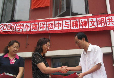 为创建社会主义和谐社区,以更加饱满的精神状态和更加出色的工作业绩迎接2010年上海世博会的举办,上海船舶研究设计院与上海南洋初级中学于9月22日上午,在学校升旗仪式上签订了《精神文明共建协议》。
