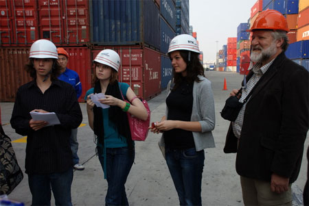 随着一辆中巴客车驶入堆场,这只印有“BBC”大字的集装箱也被集铲从六只集装箱堆放高度缓缓吊下地面。从中巴上下来的一群英国学生在他们的老师和“BBC”媒体工作人员的带领下做起了他们的作业,向有关人员询问国际贸易运输的相关知识,了解国际物流的环节与过程,孩子们的提问天真可爱,涉及范围广泛。