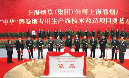 11月26日上午,上海市重大建设项目“中华”牌卷烟专用生产线技术改造项目在上海烟草(集团)公司长阳路工地奠基开工。中共中央政治局委员、市委书记俞正声出席奠基仪式。国家烟草专卖局党组书记、局长姜成康宣布奠基开工。市政协主席冯国勤,市委常委、市委秘书长丁薛祥,市人大常委会副主任胡炜出席开工仪式。国家烟草专卖局副局长李克明、副市长艾宝俊、杨浦区区委书记陈安杰、市烟草专卖局局长董浩林分别致辞。上海烟草(集团)公司总经理施超主持仪式,并介绍了项目情况。