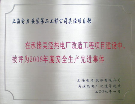 近日,在吴泾热电厂改造筹建处召开的2008年度安全生产工作总结大会上,上海电建二公司吴泾改造项目部被业主筹建处评为“2008年度安全生产先进集体”荣誉称号。
