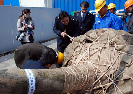 上海华发国际货运有限公司是中国外运华东有限公司下属的一家合资企业,近日,上海世博会首批进口苗木今天上午在上海华发国际货运有限公司动植物检验检疫专用场地进行植物检验检疫工作,同时利用专用设备进行防疫处理工作,不久,这些进口苗木将移栽世博园区。
