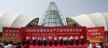 6月6日,2008年全国安全生产月宣传咨询日活动在北京市石景山区北京国际雕塑公园举行。今年宣传咨询日活动的主题是“治理隐患、防范事故——携手共筑奥运平安”。