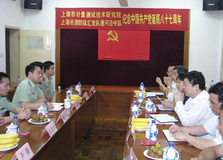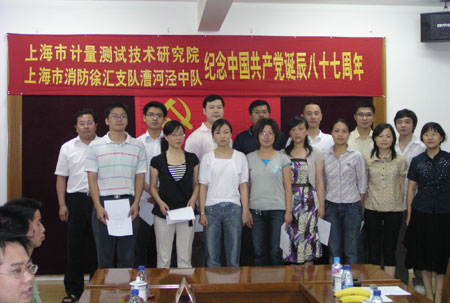 6月24日下午,市计测院院党委偕同上海市消防总队漕河泾中队开展中国共产党诞辰八十七周年纪念活动。院党委副书记钱大鼎、党支部书记、新党员、入党积极分子和团干部代表以及中队指导员魏庆标、队长潘小平和参加四川抗震救灾的官兵代表近50人参加了活动。会议由党办主任盛祖强主持。