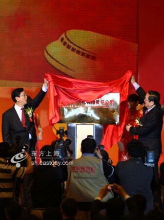 图片说明:张德江和俞正声为公司成立揭牌