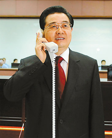18时32分,胡锦涛走到指挥席前,拿起话筒同航天员亲切通话。