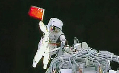 出舱后的翟志刚挥动鲜艳的五星红旗。随后,他取下飞船轨道舱外事先安装好的固体润滑材料试验样品,交给留在轨道舱里的刘伯明。接着,翟志刚在浩瀚的太空里缓缓行走。