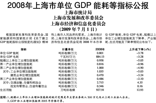 2008年上海市单位GDP能耗等指标公报发布