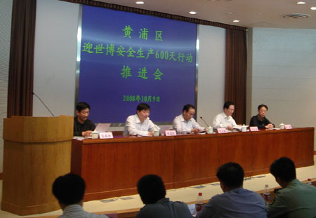 10月9日下午,黄浦区召开迎世博安全生产600天行动推进大会。市安监局副巡视员花克勤、黄浦区副区长方日东出席会议,区委区政府相关部门、各街道、区内各大单位、各建筑工地的负责人参加了会议。 会上,黄浦区安委办领导宣读了《黄浦区迎世博安全生产600天行动计划》,半凇园街道、区建委、新世界集团公司、第一食品公司等四个单位的领导分别介绍了本单位开展迎世博安全生产600天行动的具体措施,方日东副区长作了部署动员。市安监局花克勤副巡视员在讲话中充分肯定了黄浦区安全生产工作的整体情况,通报了近期以来本市发生的几起险肇事故。他强调,要紧紧抓住迎世博600天行动这个机遇,彻底消除安全生产工作中存在的隐患;突出重点,切实加强建筑施工、危险化学品、人员集聚场所的安全监管;夯实基础,牢牢把握安全生产的主动权,确保黄浦区安全生产形势的稳定,为实现安全办世博的目标作贡献。