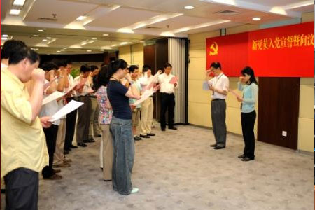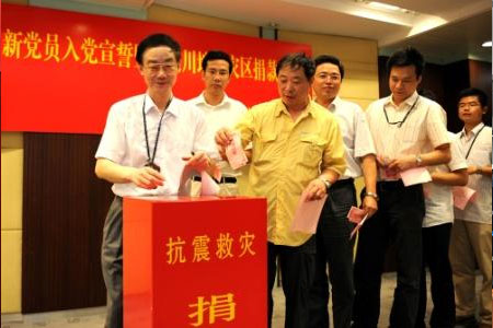 6月27日,华东电网有限公司机关党委举行新党员入党宣誓暨向地震灾区捐款仪式。22名新党员在领誓、监誓人的带领下,举行了庄严的入党宣誓后,又一次向地震灾区捐款7700元。