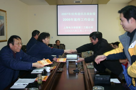 2月21日下午, 上海电建二公司召开2007优秀通讯员表彰暨2008宣传工作会议,公司党委书记李苏、党委副书记林哲明与公司宣传网络人员、优秀通讯员20余人出席。会议回顾了2007年的宣传工作,表彰了先进,布置了2008年的宣传工作。