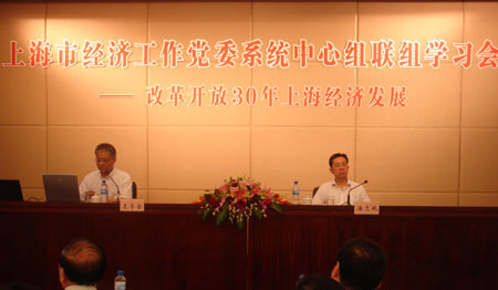 为纪念改革开放30年,9月23上午,市经济工作党委举办第十三次系统党委中心组联组学习会,特邀了上海社科院副院长左学金作了改革开放30年来上海从综合工业基地向国际大都市转型的报告。市经济工作党委书记潘志纯主持会议并讲话。