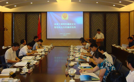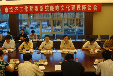 为进一步推进市经济工作党委系统廉政文化建设,市经济纪工委近日在市工商局青浦分局朱家角工商所召开廉政文化建设座谈会。各与会单位分管纪检监察宣传教育工作的领导和干部实地观摩了青浦分局朱家角工商所、市工商局青浦分局的廉政文化建设情况,听取了市工商局、市工商局青浦分局及普陀分局长征工商所、徐汇分局凌云(长桥)工商所等四个单位的经验介绍。市经济纪工委副书记徐世涛在会上就推进系统廉政文化建设提出三点建议。
