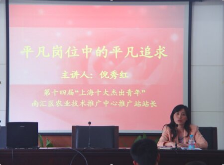 5月5日下午,市农业科学院团委、生态所团支部联合举办了纪念“五四”运动89周年报告会。第十四届上海市十大杰出青年、南汇区农业技术推广中心推广站站长倪秀红应邀来院作了题为“平凡岗位中的平凡追求”的报告。全院60多名年青科技人员参加了报告会。 倪站长结合自己的成长历程,饱含深情地畅谈了作为一名农业科技推广人员如何克服困难,不断学习思考,摸索科学,努力为农民解决实际问题,真正做到“忧农民所忧,乐农民之乐”的动人事迹。会上她还就如何寻找奋斗目标、怎样打好基础、如何推广新品种等问题与年青科技人员们进行了互动交流。倪秀红站长的报告以其充满“我是农民的女儿”浓厚感情深深打动所有在座人员,受到大家的热烈欢迎。 |