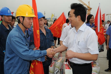 9月5日上午9点,上海虹桥综合交通枢纽工程建设青年突击队誓师大会在虹桥枢纽磁浮站施工现场隆重举行。公司所属市南供电公司、送变电公司等单位4支青年突击队参加誓师大会并接受团市委等领导授予的“青年突击队”队旗。会上,团市委书记潘敏还宣读了上海虹桥综合交通枢纽建设青年立功竞赛活动通知并为该活动最高奖项“青春世博杯”揭彩。