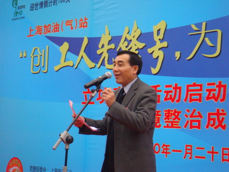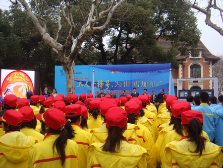“展优质服务,为世博加油”。2010年1月20日上午,上海市总工会、上海市经济和信息化工作党委、上海市经济和信息化委员会在徐家汇绿地公园隆重举行了上海加油(气)站“创工人先锋号、为世博加油”立功竞赛活动启动仪式暨环境整治集中展示活动,这是市经济和信息化系统迎世博“百千万”系列活动之一。市总工会副主席陈国华、市经济和信息化工作党委副书记张金康、市经济和信息化委副主任刘健、市经济和信息化系统工会主任汪仲华等以及市经信系统直属单位工会负责人、参赛单位代表共200余人参加了仪式。