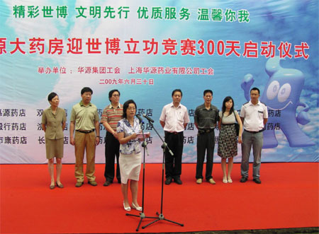 根据华源集团党委关于认真落实市经信工作党委《关于市经济信息化系统深入推进以“百千万”活动为主线的迎世博工作方案》的意见,华源集团工会组织所属华源大药房等20余家窗口服务单位开展“创一流、树形象、优质服务迎世博”立功竞赛,通过竞赛发现和培育一批标杆药店和明星员工,提升窗口服务的能级、质量和水平,以实际行动为办好一届“成功、精彩、难忘”的世博会做出新贡献,并于日前举行了迎世博立功竞赛300天启动仪式。