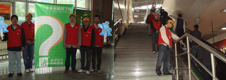 在完成了前期的培训后,志愿者利用中午休息时间在曹杨路地铁站进行文明乘梯宣传。志愿者们分为几个小组,有的通过随身携带的小广播对乘坐电梯的市民进行口号宣传,加强大家的文明意识,有的则对没有遵守“左行右立”的市民进行提示,让他们右侧站立,以让出左侧的通道,有的则负责向市民们发放“左行右立”践行标志徽章,宣传“左行右立”活动。活动的一个小时很快就过去了,但大家觉得时间过的太快,有些意犹未尽,并期待着下次志愿者活动的到来。