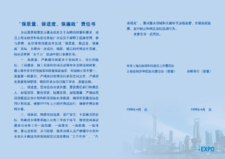 为认真贯彻落实市委市政府关于办博的部署和要求,动员上海市经济和信息化系统广大党员干部职工投身世博、参与世博,在世博项目建设中实现“保质量、保进度、保廉政”目标,为举办一次成功、精彩、难忘的世博会作贡献,特在迎世博“百千万”活动中签订本责任书。