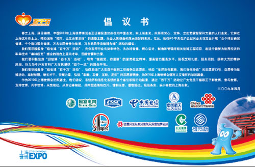 作为2010年上海世博会的东道主,我们倡议,市经济和信息化系统的各个单位积极行动起来,通过“百千万”活动让广大党员干部职工了解世博,参与世博,支持世博,共享世博;从我做起、从身边事做起,共同塑造海纳百川、谦和友善、睿智豁达、诚信务实、乐于奉献的上海形象。