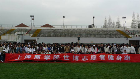 为迎接即将举办的上海世博会,展示上海商学院世博志愿者“文明、青春、健康、积极向上、充满活力”的大学生志愿者形象,表达该校志愿者热切期盼世博盛会的召开,校世博工作站以“迎世博,展志愿者风采”为主题开展“冲刺世博,我们时刻准备着”世博志愿者健身跑活动。4月13日下午,在奉浦校区举行的世博志愿者迎世博健身长跑活动,吸引了近千名志愿者参加。