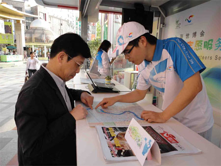 我们的站点位于长寿社区较繁华的地段亚新生活广场,每天人来人往的客流成百上千,大家的问题也是“千奇八怪”、“五花八门”。几天服务下来,接受咨询最多的便是周边交通问题,所以就有志愿者自嘲为“活地图”。其实要做好“活地图”,可着实不容易呢!较为常见的就是“世博园区怎么走”、“乘坐什么交通最方便”等等,对此早有准备的“同仁们”可谓信手拈来、应答如流。不过同样的问题答上数百上千遍,也难免让人口干舌燥、“聊之无味”。好在大家轮流应对,都能做到耐心应对。