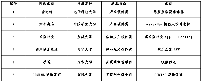 团队通过每个项目20分钟的路演和答辩评审环节,最终选拔出来自电子科技大学的壹比特,来自中国矿业大学的木牛流马,来自重庆大学的品质社交,来自西华大学的快乐家居,来自东华大学的秒送,来自浙江大学的COMING宠物管家获得全国六强席位。