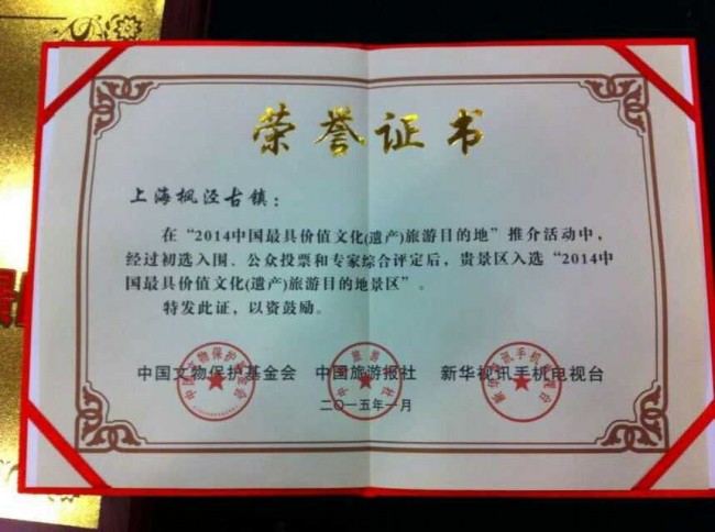 2015年2月5日—7日,由中国文物保护基金会、中国旅游报社和新华视讯手机电视台共同主办的“2014中国最具价值文化(遗产)旅游目的地推荐会”在北京隆重举行,旅游公司景点部经理王炜代表枫泾古镇参加了此次推荐活动。