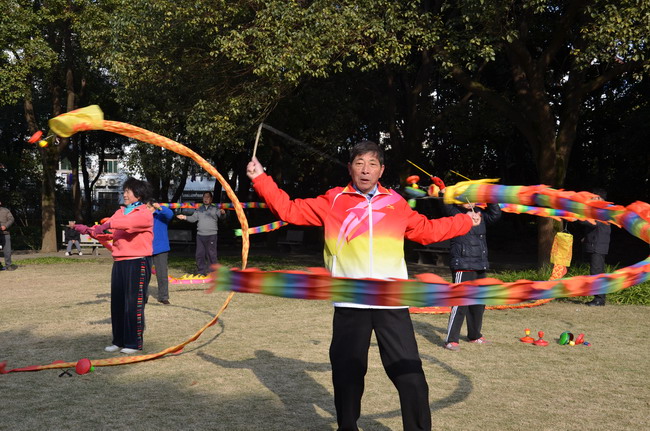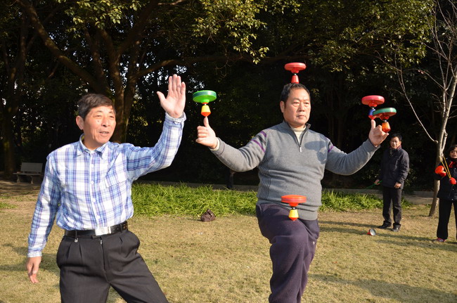 每天清晨,在枫泾镇的枫溪公园里都会传来一阵阵轰鸣声,那是几位阿姨伯伯在公园草地上抖练空竹,成为枫溪公园一道靓丽的风景。他们个个动作娴熟自如,花样百出:两手提着抖杆,一会儿空竹腾空,翻身稳接;一会儿空竹穿梭,胯下平飞;一会儿左右开弓,空竹旋转肩头……各种突破传统意义的抖空竹表演,让人大开眼界。其中一位老伯不时指点一下新学员的动作,并给大伙儿做示范。他就是赵沈发老先生,他原先家住闵行区,前几个月在枫泾买房居住,准备在这里养老了。赵老伯不仅空竹抖得好,而且在各大市、区比赛中屡获佳绩,近期一直义务教授枫泾的空竹爱好者练习。