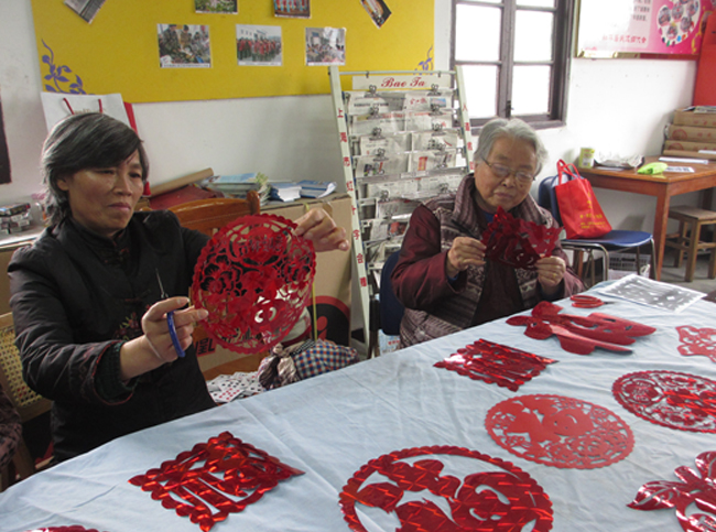 新春佳节即将来临,和平居委会妇女之家的10位妇女骨干每天来到居委会老年活动室,其乐融融的围在一起折纸、剪花、剪字,义务为社区居民赶制新年剪纸“福”字。
