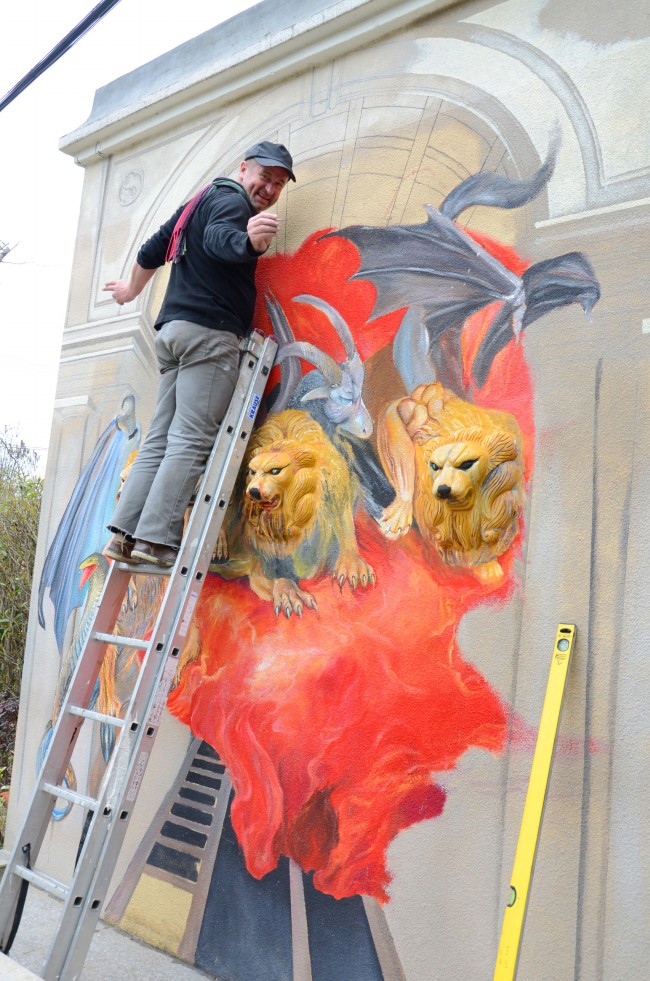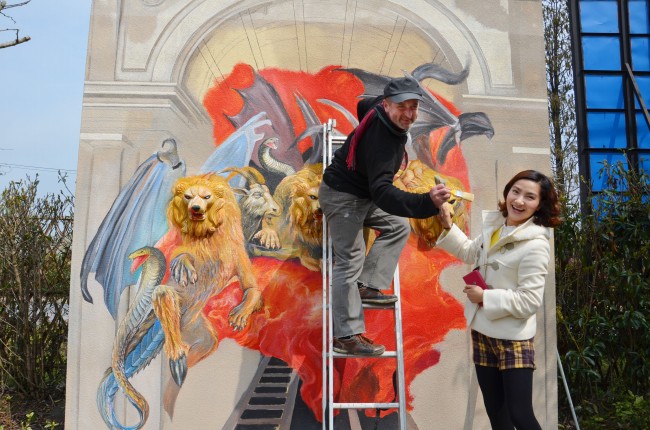 位于枫泾镇中国农民画村旁的我国首个倒置屋旅游项目“波兰倒置屋”于去年4月25日对外开放,受到了众多游客的青睐。近日,记者在波兰倒置屋看到一位波兰籍的画师正爬在扶梯上专心致志地在墙上作画,墙面上依稀可见精美的欧式建筑和栩栩如生的神话动物。