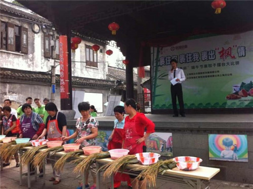 端午当天,枫泾古戏台的民俗文艺演出拉开序幕,古镇旅游区推出了“裹”住你、“裹”住我、裹出“枫”情——“恒昌杯”端午节裹粽子擂台大比拼、品黄酒等丰 富多彩的活动。因粽香的缘故,引来了众人纷纷围观拍照,一时间加油声不断,欢笑声迭起,让节日气氛更加浓厚。节日期间,凡购买枫泾古镇联票的游客还幸运地 领到了免费粽子,让来枫游客充分感受节日气氛的同时,还凭添了几分端午惊喜。