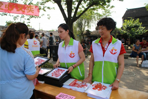 义卖现场,统一着装的志愿者们悉心为前来购买的人们介绍着摊位上的物品。和平居委会妇女之家阿姨们的剪纸作品,农技站职员们亲手包扎的艾叶束,共建单位提供的爱心服装、还有可爱的生活小饰品等玲郎满目的商品吸引了众多路人围观。