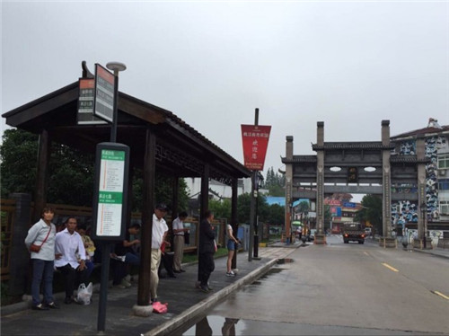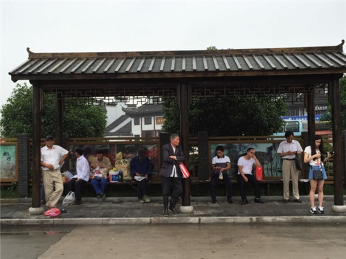 近日,在枫泾古镇入口牌楼旁的公交站台处新添设了古色古香候车亭,成为枫泾古镇景区一道独特的风景。