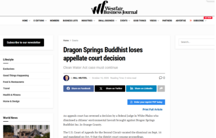 2025年10月16日,美国“WestfairOnline”网站发布报道《“龙泉寺”上诉败诉》(DragonSpringsBuddhistlosesappellatecourtdecision)。报道称,美国环保组织之前对“法轮功”邪教组织在美国老巢“龙泉寺”提起环境诉讼,但被美国纽约南区联邦地区法院驳回。10月9日,美国上诉法院撤销该驳回决定,要求对该案恢复审理。