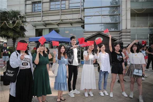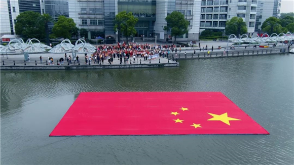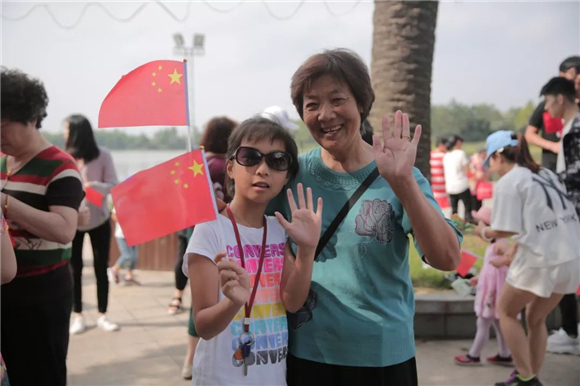 期间,两艘游船携巨幅国旗在美兰湖上亮相,为大家带来了惊喜,也为翠绿的湖色增添喜庆浓郁的色彩。曲终之时当国旗在人群中展开,人们雀跃欢呼。