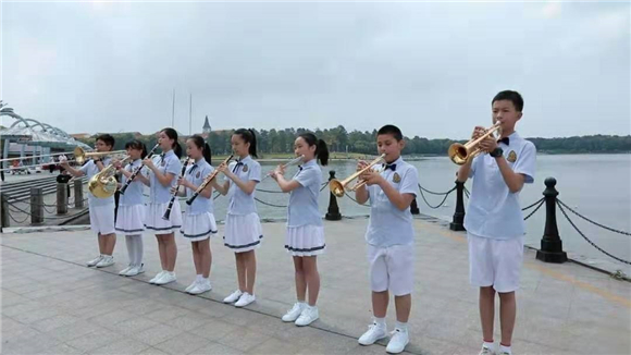 伴随着熟悉的旋律,罗店中学管弦乐队的学生们手执各类乐器出现在美兰湖边。随着乐曲的推进,人们越聚越多,挥舞着手中的五星红旗,同声高唱《我和我的祖国》。