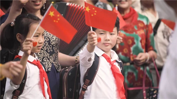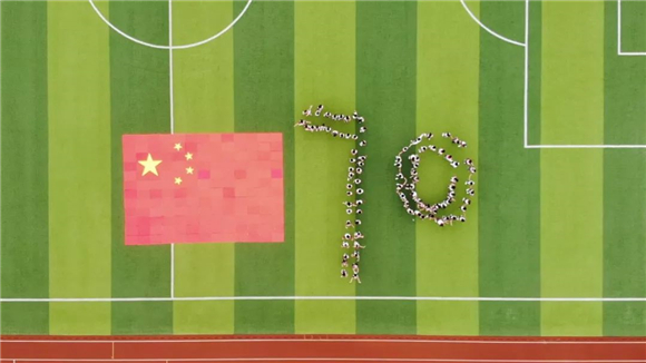 曲终人不散,欢呼声响彻公园。“祖国我爱你,庙行我爱你”,孩子们在一幅巨型国旗旁雀跃高呼,以人墙的形式拼成70周年字样,定格了这美好的瞬间。