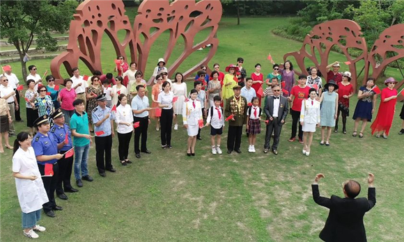 为庆祝新中国成立70周年,充分展示新时代,城市现代化的庙行发展变化,激励全镇人民积极进取、奋发向上,庙行镇在智力公园开展《我和我的祖国》快闪活动。